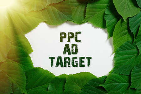 Writing displaying text Ppc Ad Target. Word Written on Pay per click advertising marketing strategies online campaign Important Informations Written On Paper Under Lot Of Leaves.