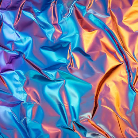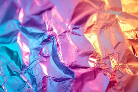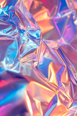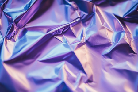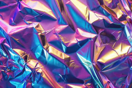 Iridescent crumpled foil background with vibrant colors of purple, pink, and blue The light reflects off the surface creating a dynamic and artistic feel