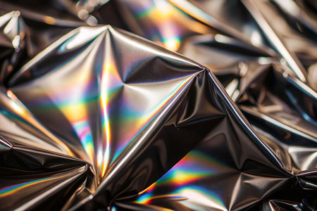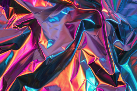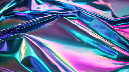 Holographic crumpled foil creates a vibrant and colorful abstract background with a modern and futuristic aesthetic