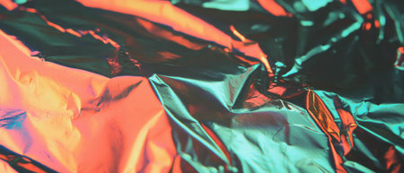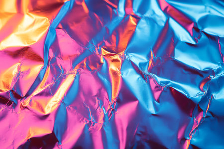 Shiny crumpled aluminum paper forming intricate textures, bathed in bold, vibrant neon tones
