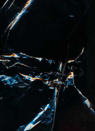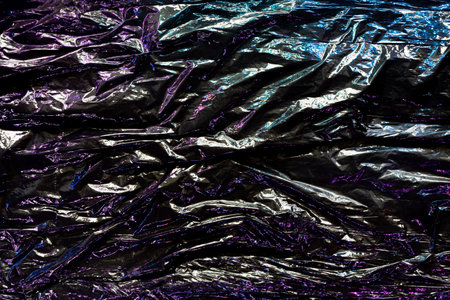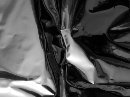 Black color plastic wrap background. Dark crumpled wrinkled plastic cellophane. Reflecting colorful iridescent light and shadow on creases and folds in plastic surface. Texture overlay effect template