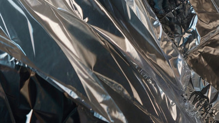 Crumpled silver metallic foil texture captured in a dramatic close up, showcasing sharp creases, deep shadows, and bright, reflective highlights. ideal for abstract backgrounds.
