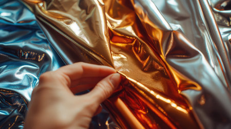 A seamstress's hand delicately selecting shiny, metallic fabrics in gold, silver, and bronze, showcasing futuristic and innovative design ideas for avant-garde apparel.