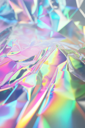 Abstract iridescent background design, 3d render, featuring a crystalline, prismatic texture. The iridescent surfaces shimmer with a spectrum of colors, creating a magical and captivating visual effect.