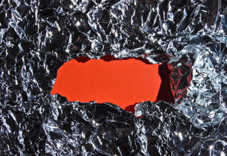 Torn Frame of crumpled foil with orange space for infirmation. Copy space