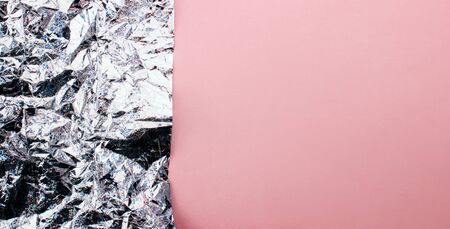Background with crumpled holographic silver foil texture and colorful pink paper. Abstract backdrop template design in minimal style. Stock photo.