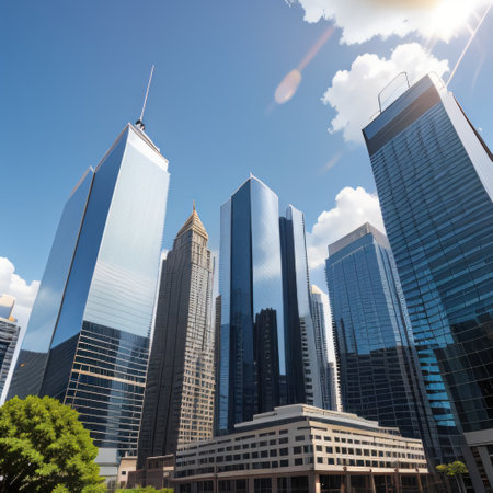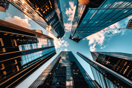 The image showcases several skyscrapers from a low-angle perspective, emphasizing their height and architectural detail. The composition includes buildings with reflective surfaces. The setting appears to be a city during daylight hours, with sunlight illuminating the scene. The image displays a perspective shot highlighting the buildings.
