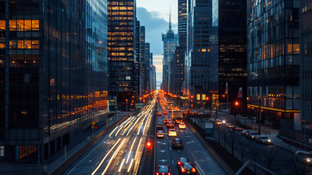 A blurry cityscape with a lot of lights and cars. The city appears to be in motion, with the lights and cars streaking past each other. Scene is energetic and dynamic, with the city's hustle