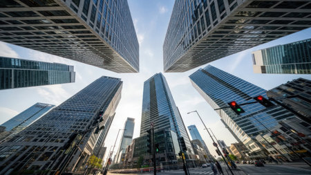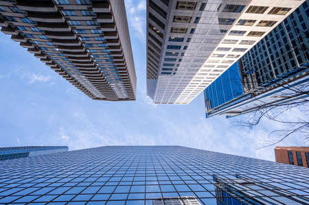 Impressive modern skyscrapers reaching for the sky in the business district of a major metropolis, bottom view