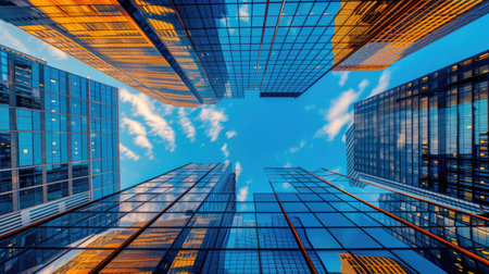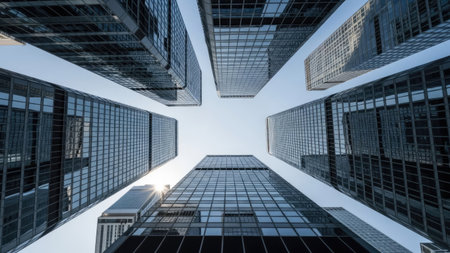 High-angle perspective captures a cluster of towering skyscrapers. The buildings ascend towards a clear blue sky, demonstrating a modern architectural style. The composition includes visual elements that suggest an urban setting, the scene being bathed in natural light. This arrangement creates a sense of scale.
