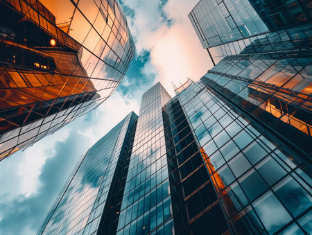 Low angle of typical contemporary tall structures with glass financial and
