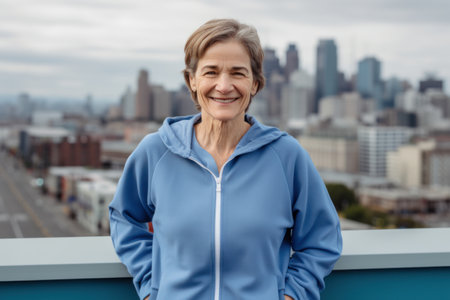 Portrait of smiling senior woman in sportswear standing on rooftop with New York city view