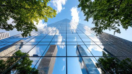 Looking upward, the vibrant reflections of skyscrapers dominate the view, showcasing modern architecture against a backdrop of clouds and blue sky.