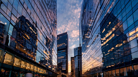 Modern skyscrapers with glass mirror walls. Business center, mirror reflection of high-rise buildings.