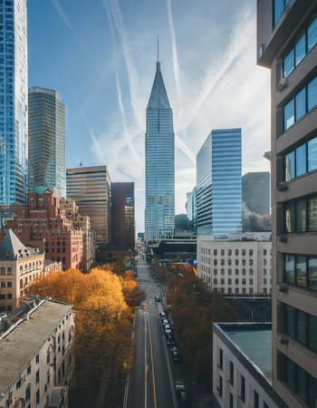 Enjoy the mesmerizing view of azure skies against a row of magnificent skyscrapers, a sight that showcases the beauty of architectural art in the real estate world. AIG41