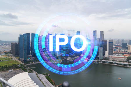 IPO icon hologram over panorama city view of city, the hub of initial public offering in Asia. The concept of exceeding business opportunities. Double exposure.