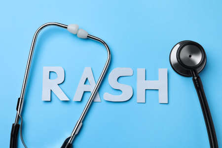 Word Rash made of paper letters and stethoscope on light blue background, flat lay
