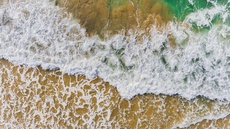 Aerial view of ocean waves breaking on sandy beach. Top view