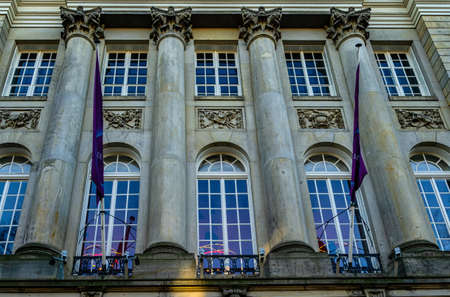 Historic facade details of the German Reichstag building (house of parliament) with classical architecture features.