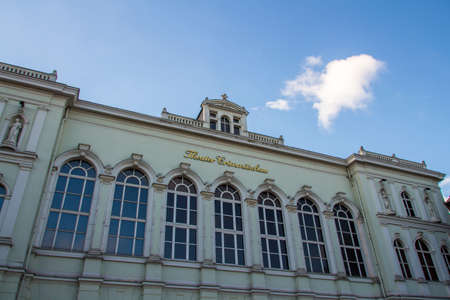 Architectural fragment of National Theater. Renaissance gallery with arches, lamps and doors, Prague, Czech Republic - May 26, 2020