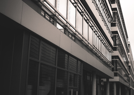 Abstract image of looking up at modern glass and concrete building. Architectural exterior detail of office building. Industrial art and detail. Sunrise.