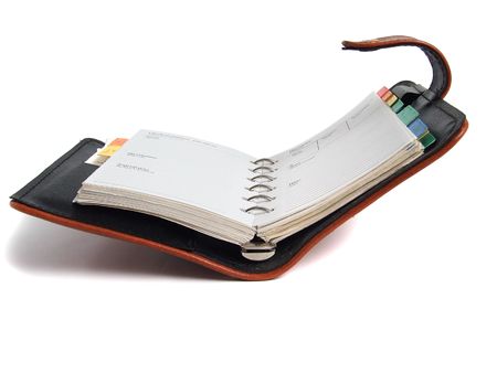Undated diary on rings. Pages is clean. Have green, blue and yellow stickers. Close-up view.