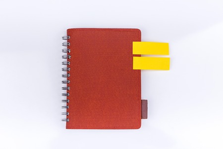 Close-up of notebook planner and sticky notes as pov and professional workspace concept