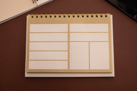 Notebooks and calendar on brown color table. Top view. Copy space.