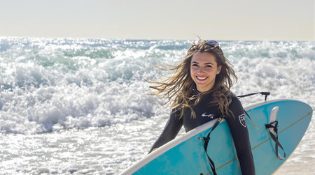 A young woman on the sun-kissed beach, her joyful expression lighting up the scene. With a surfboard under her arm.