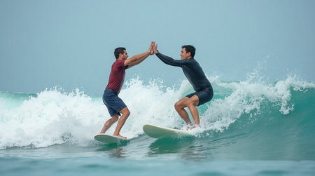 Two surfers high-fiving while riding turquoise waves, celebrating success and adventure together
