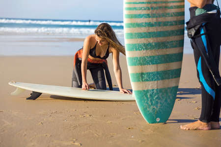 Two beautiful surfer girls at the beach getting ready for surfing