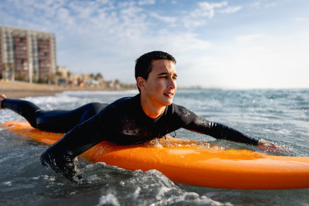 surfer lying on his surfboard and smiling happily while floating in the sea generative ai