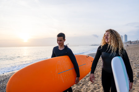 Two happy young surfers with surfboard prepares to hit the waves at sunset. Sports active vacation