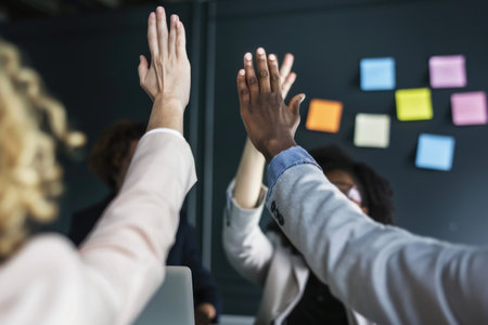 group of colleagues giving a high five in meeting in the office. ai generated