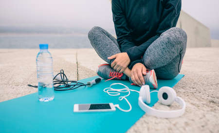 Low section of woman sitting on yoga mat with sport accessories