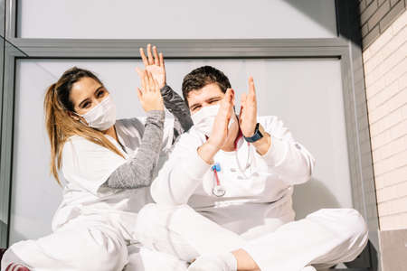 Delighted female and male medics in masks and uniform sitting on floor on balcony and clapping hands while looking at camera