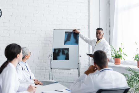 african american doctor pointing at lungs x-rays near blurred colleagues during council
