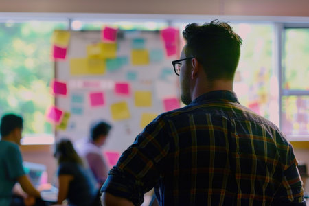 A man with glasses in a plaid shirt stands in front of a whiteboard covered in colorful sticky notes, reflecting on the ideas generated during a brainstorming session.