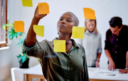 Expanding on a new concept. a young businesswoman writing notes on a glass wall in an office.