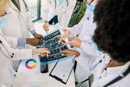 Computed tomography concept, covid 19 pandemy. Close up cropped top angle image of multiracial group of doctors looking at X-ray CT scan of lungs and discussing the diagnosis and treatment.