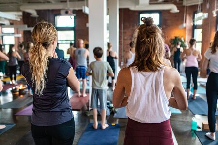 Diverse group of people in yoga class. A large group of people are seen from behind, standing on mats and facing the same direction as they practice sacred yogic exercises for health & mindfulness.
