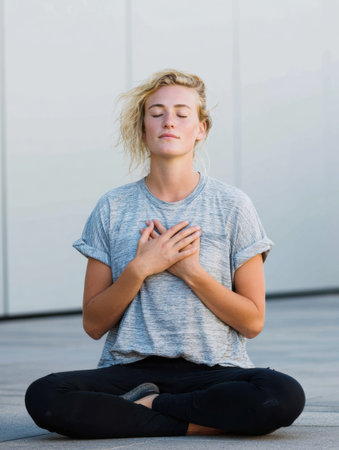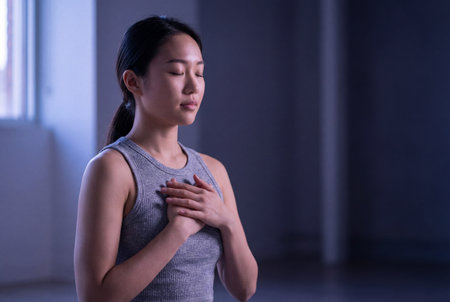 Woman practicing mindfulness with closed eyes, holding her hand on chest, connecting with inner self and finding peace