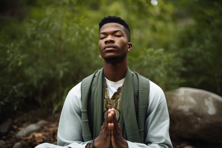 A serene individual is meditating in a stunning natural environment, surrounded by lush greenery. This peaceful scene captures the essence of mindfulness and tranquility, ideal for promoting wellness and relaxation themes.
