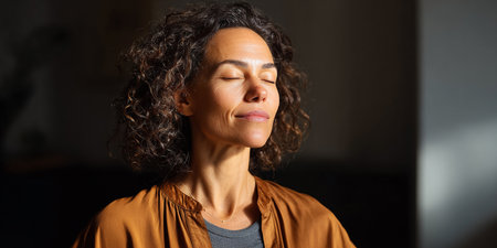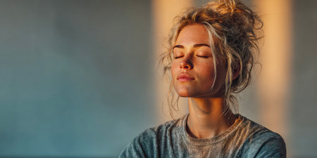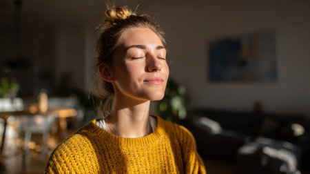 Serene woman with closed eyes relaxing in warm natural light indoors