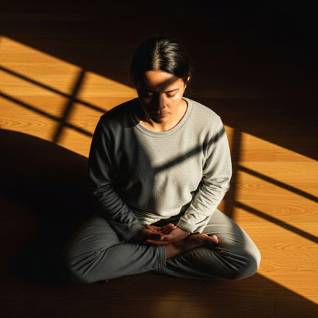 Person meditating indoors in harsh morning sunlight, captured from a cinematic high angle top-down v