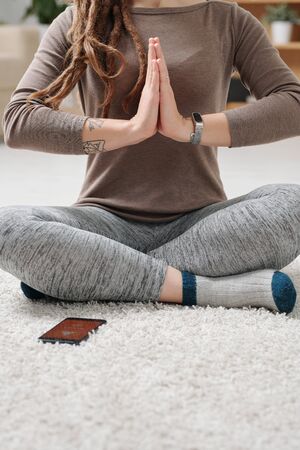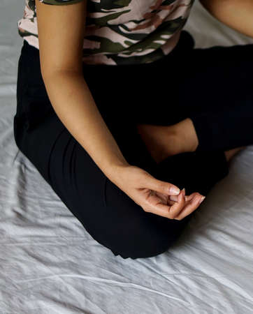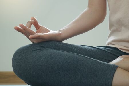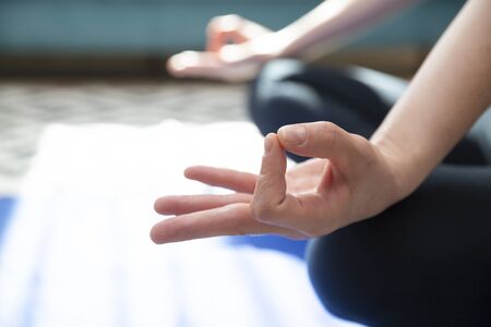 Close up of hands of unrecognizable woman holding hands in mudra practicing home yoga. Girl meditating and relaxing in lotus pose.