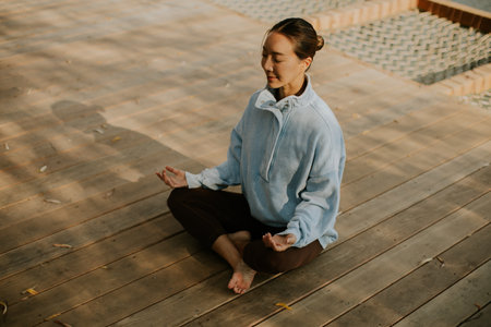 Korean woman sits cross-legged on a wooden deck, eyes closed in deep meditation, surrounded by nature's calm.