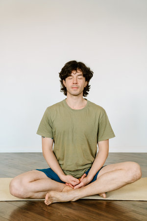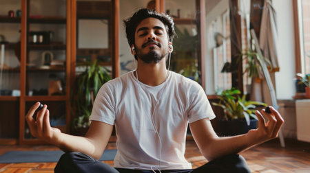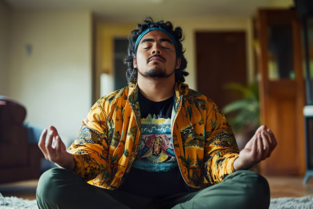 Maori Man Meditating Indoors in Casual Wear, Focused and Peaceful Ambiance.