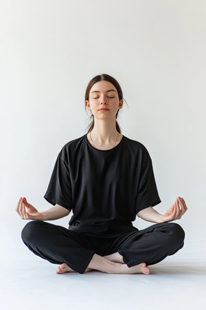 A young woman with her eyes closed meditates during a yoga class, focusing on her breath and achieving inner peace.