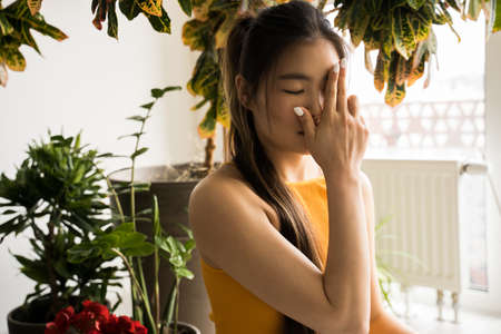 Young woman meditating peacefully indoors surrounded by lush green houseplants and natural light. High quality photo